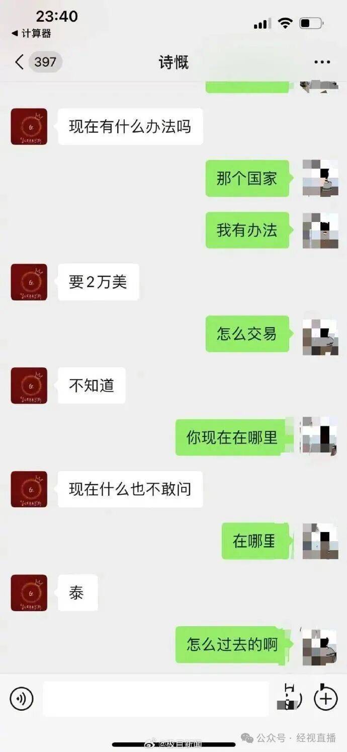 10月27日晚上,廖某的微信开始直接与朋友对话,微信向朋友索要2万美元,然后疑似廖某本人回了几个字,比如“三个人看着我”,但每次都是发完就立刻撤回。问他在哪,他回了一个“泰”字。廖某的朋友直接问“你要怎么样才放过我朋友”,对方的态度很强硬,声称“不会放人”,甚至威胁说“要你兄弟的命”。最后,对方要求将1万元人民币转到指定的支付宝账户,家人没有转。