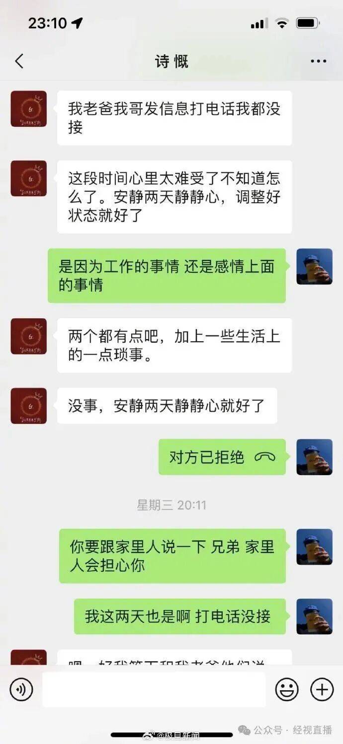 10月13日,廖某和朋友进行了最后一次微信聊天,之后联系就变得断断续续。10月22日晚上,家人通过廖某的发小给弟弟发消息,弟弟答应给父母回电,但家人迟迟没有接到电话。10月23日,家人通过另一位朋友以还钱的名义找弟弟,弟弟称手机快没电了,要求转到一个陌生的支付宝账号。家人怀疑与他们对话的已经不是本人了。